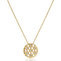 This 14k gold necklace features a circular pendant with honeycomb cutouts shaped as delicate Stars of David set with diamonds for the perfect sparkle, Understated yet striking, it's crafted for those who appreciate discreet meaningful detail. a piece that reveals its beauty to those close enough to notice.